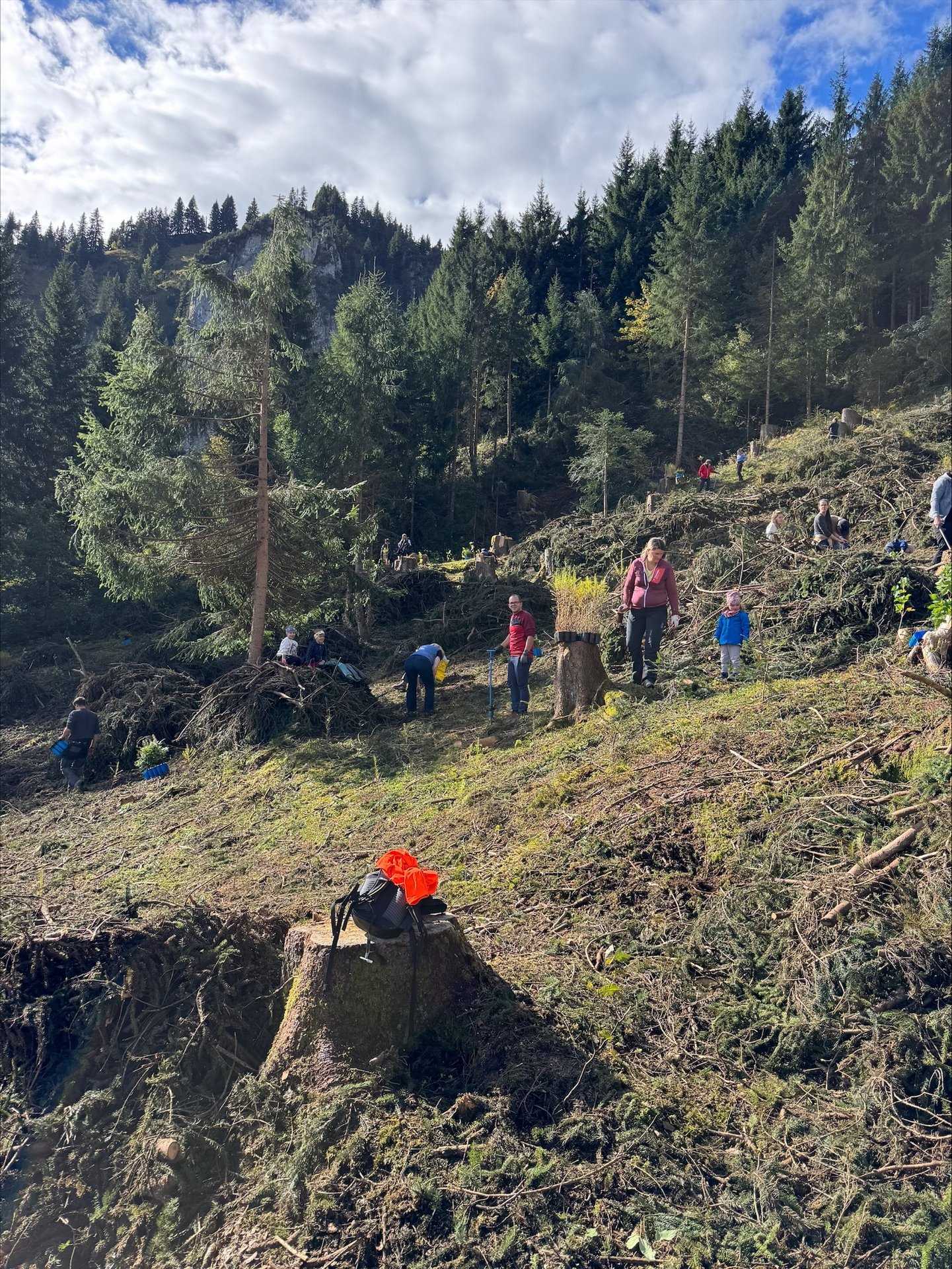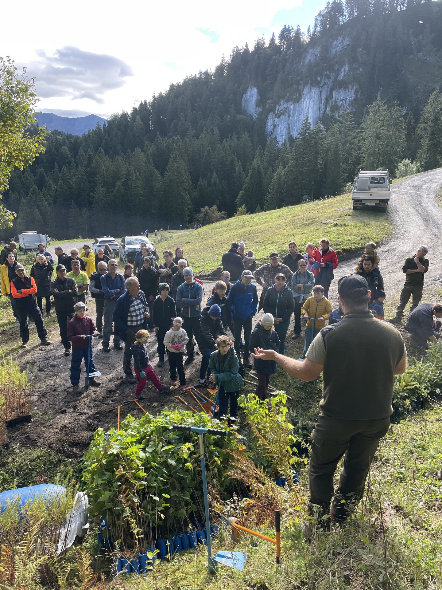 Nach Begrüßungsschnäpsle und Gruppenfoto machte sich die Gesellschaft teils zu Fuß, teils per Shuttle auf den Weg zum Pflanzort. Nach einer kurzen Einführung durch Matthias Petschnig, Leiter des Forstamtes verteilten sich die vielen Helfer, bepackt mit Pflanzgeräten und Bäumchen, im Gelände und machten sich an die Arbeit. Unterstüzung erhielten sie durch die Mitarbeiter vom Forstamt Thomas Wohlgenannt und Samuel Thurnher.