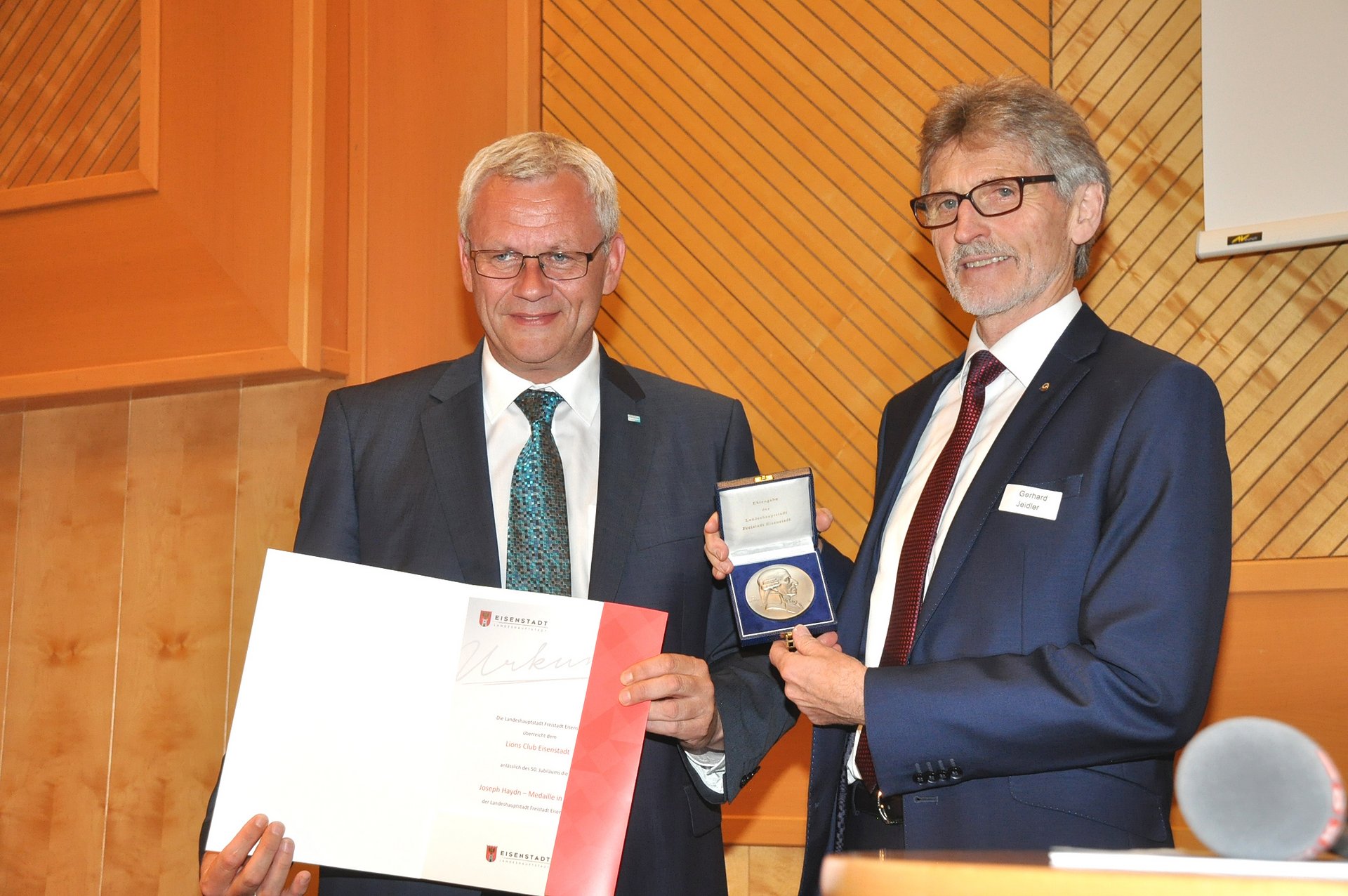 Am 30. April 2019 feierte der Lions Club Eisenstadt im Festsaal der Wirtschaftskammer Burgenland mit 200 Gästen seinen 50. Geburtstag. Nach einem Sektempfang begrüßten Wirtschaftskammerpräsident Ing. Peter Nemeth, Bgm. Mag. Thomas Steiner und Landeshauptmann a.D. Hans Niessl die Teilnehmer und dankten dem Club für die hervorragenden Leistungen. Bgm. Steiner würdigte diese durch die Verleihung der Joseph Haydn Medaille der Freistadt Eisenstadt. Präsident Jeidler ehrte sodann das Gründungsmitglied Herbert Winkler. Grußbotschaften der Governorin Karin Widermann und Glückwünsche der befreundeten Clubs folgten. Abschließend referierte Bundesminister Hartwig Löger in seinem Festvortrag über Wirtschaftsethik und Finanzwirtschaft.