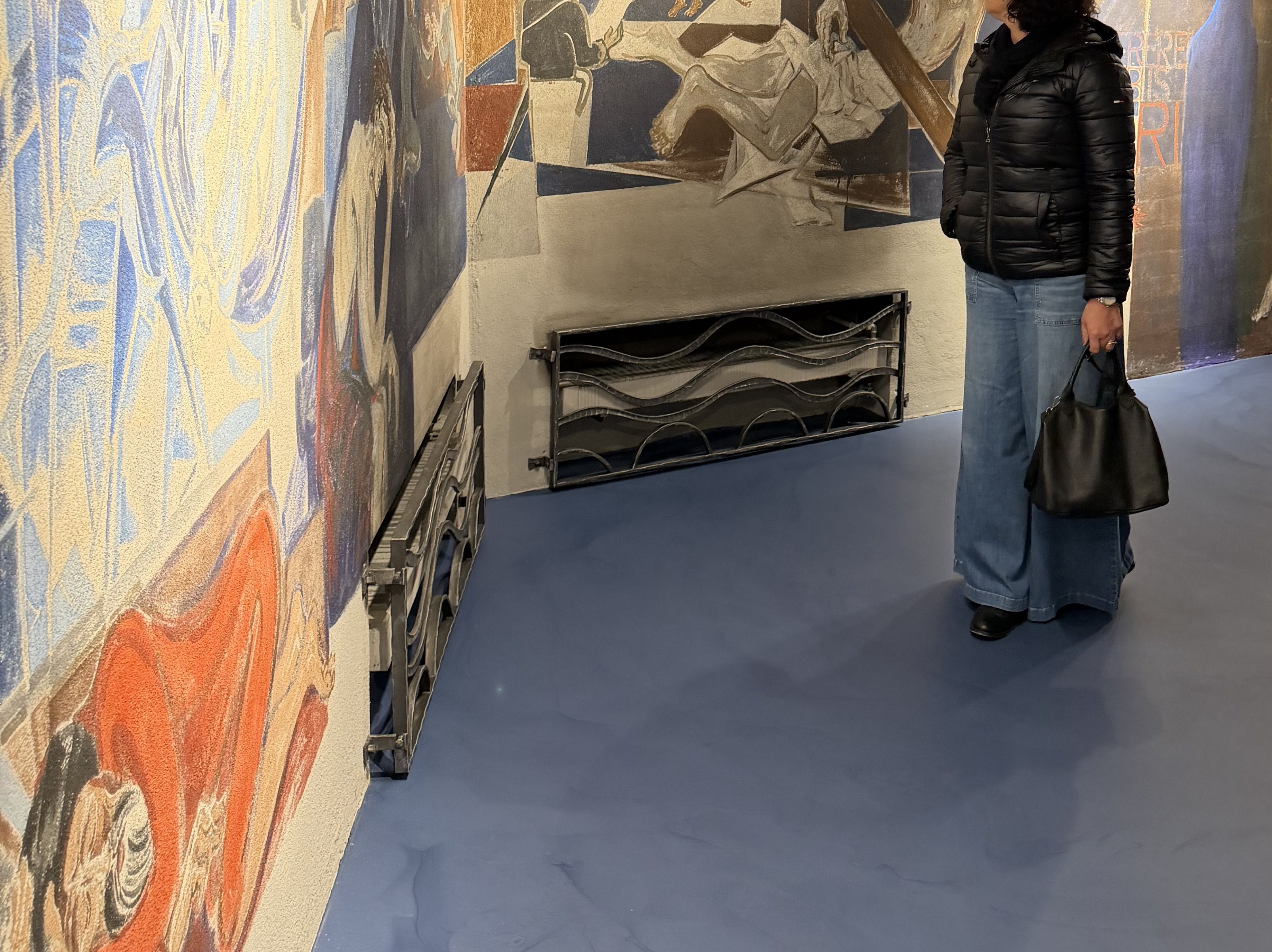 In der Unterkirche entstand zu Beginn der 1980er-Jahre ein beeindruckendes Kunstwerk: Die Hohenemser Künstlerin Heilgard Bertel erhielt damals den Auftrag, die Betonwände künstlerisch zu gestalten. Ziel war es, die Krypta als Meditations- und Diskussionsraum für Jugendliche zu nutzen. Und ja – die Darstellungen waren und sind Diskussionsstoff. Genau das macht sie so kraftvoll, führte jedoch gleichzeitig auch zu Kontroversen; sogar eine Übermalung wurde in Erwägung gezogen. Schlussendlich versank der Raum für Jahrzehnte in eine Art Dornröschenschlaf.