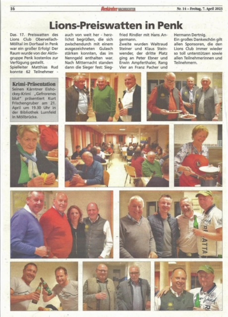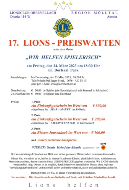 Das 17. Lions – Preiswatten im Dorfsaal in Penk war ein großer Erfolg, dieser wurde von der Aktivgruppe Penk kostenlos zur Verfügung gestellt.